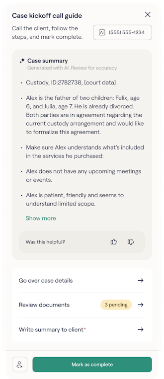 Before each case kickoff call, you’ll see a summary of key information based on the client’s intake and engagement—helping you be prepared without the extra prep time.