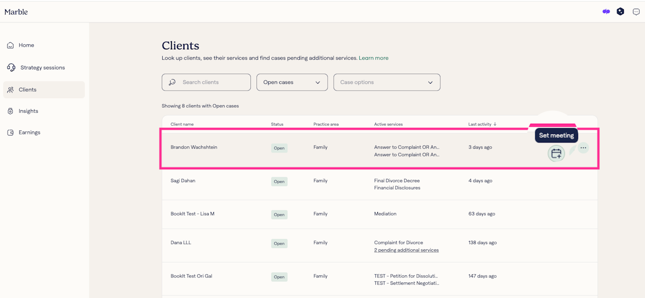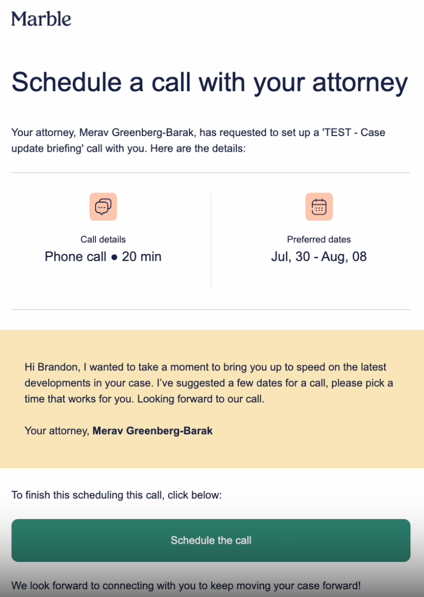 Scheduling meetings has never been easier! Attorneys who co-counsel with Marble have the ability to set meetings with their Marble clients from the convenience of their Marble desktop.