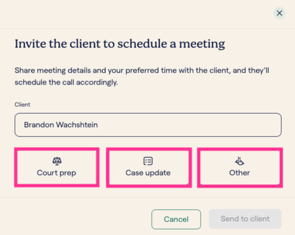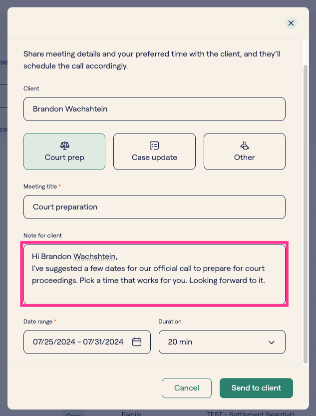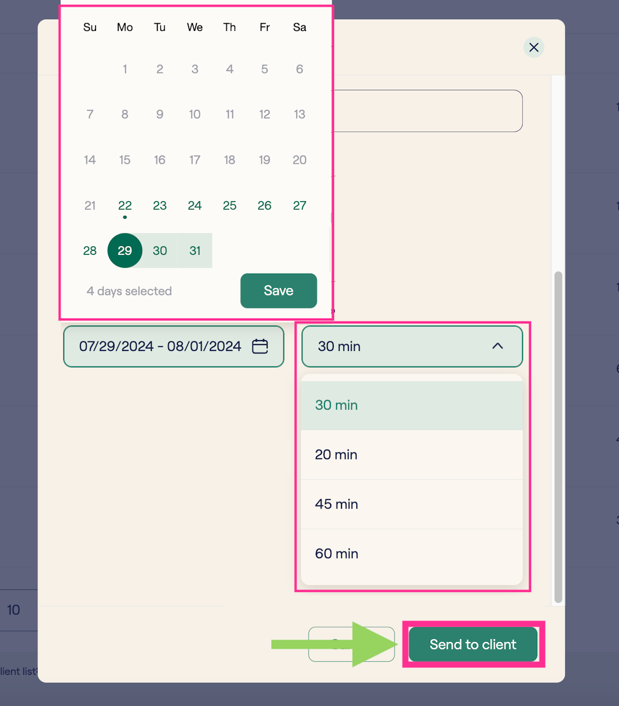 Step 5: Set a range of dates, the duration of the meeting, and then click 'Send to client'