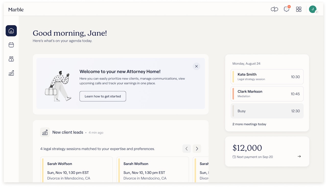 Manage key dates effortlessly in your Marble Home. Track court hearings, mediation, court deadlines, trial dates, and more—all in your Marble platform. Sync seamlessly to your calendar, send auto invitations for clients, and stay focused on delivering results without missing a deadline. Here’s where you can see key dates for each client in your Marble Home.