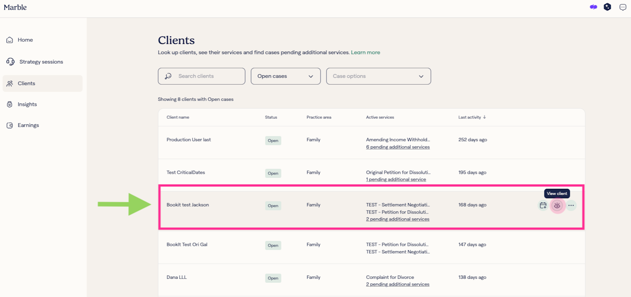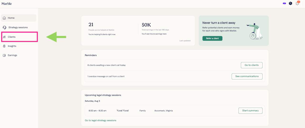 Step 1: Go to the 'Clients' tab on your Marble Attorney Home page