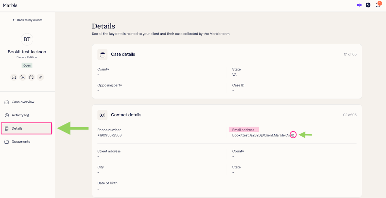 Step 3: Once in their profile, select the 'Details' tab on the left-hand side. You will see the client's Marble email under 'Contact Details'